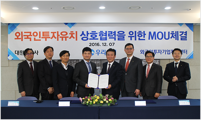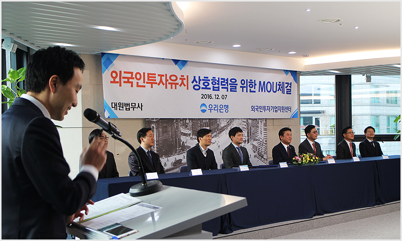 외투센터는 2016년 12월 7일 우리은행 본점에서 투자자들을 효율적으로 섬기고, 금융서비스와 관련된 투자자들의 필요를 충족시키기 위해 한국의 주요 금융기관인 “우리은행”과 업무 협약을 체결하였습니다.
